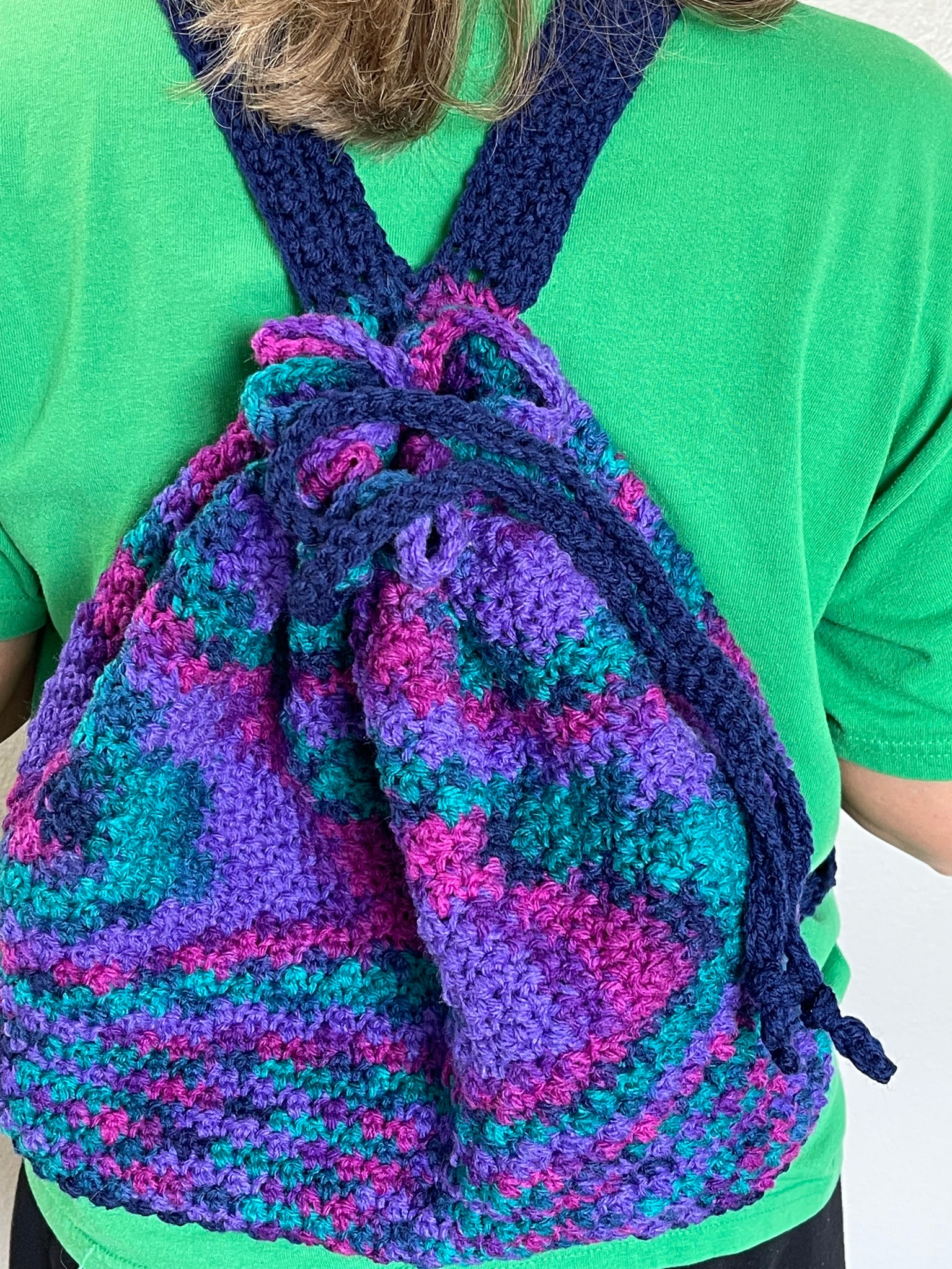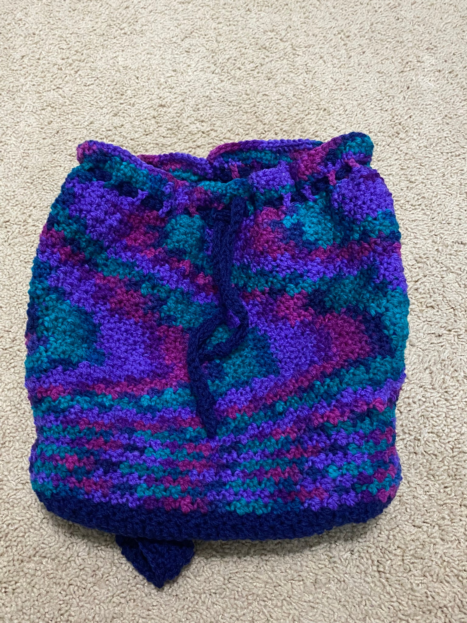 Crocheted drawstring backpack measures 5 inched wide, 11.5 inches long, 12 inches deep