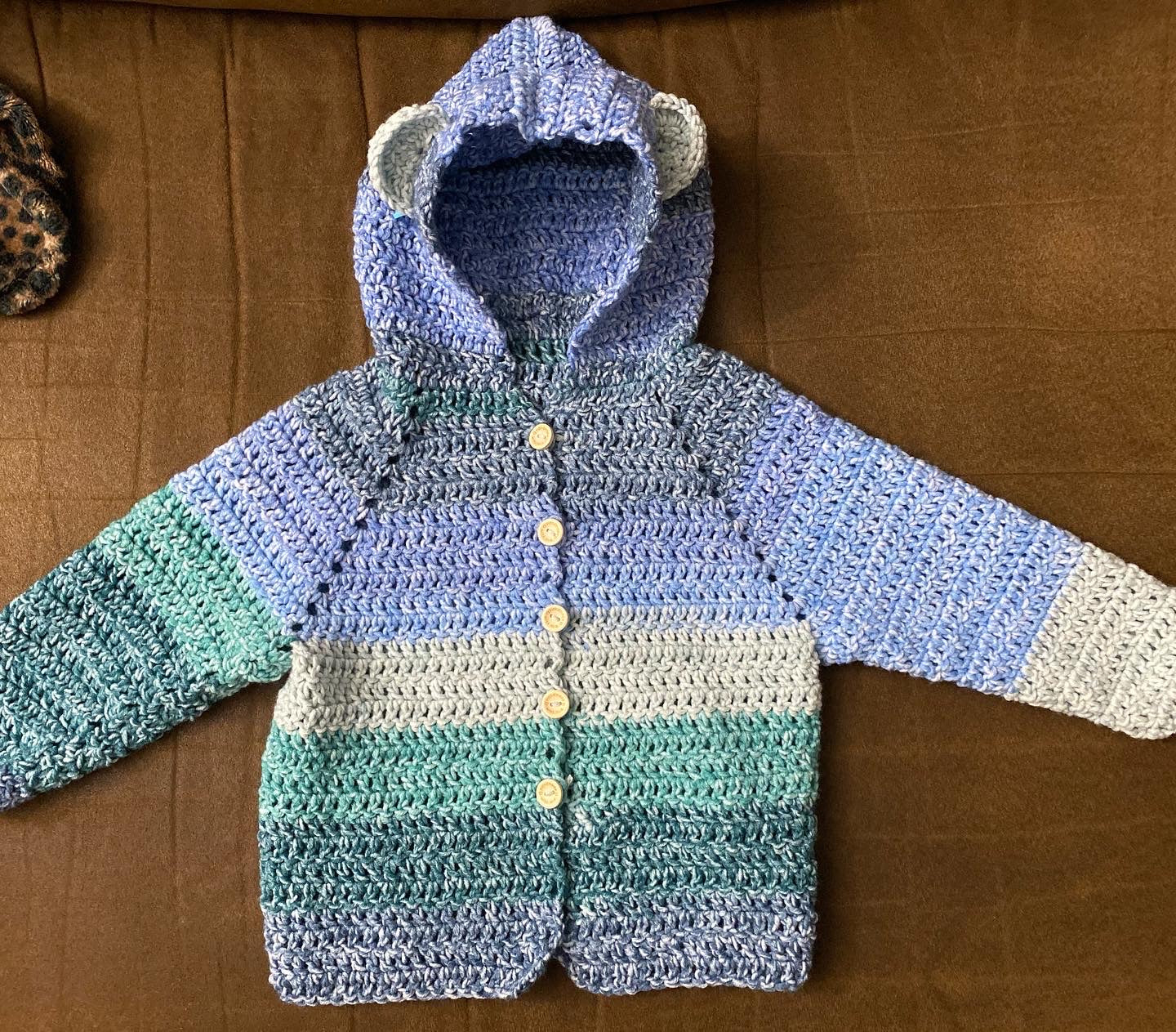 Long sleeve soft cardigan sweater was Handmade with Love by the owner. The blue one pictured fits a size 9-12 months, the green and pink ones fit 6-9 months. These can be custom made in a different color and/or size with a possible price change depending on time and material. Message/email us with customization requests.