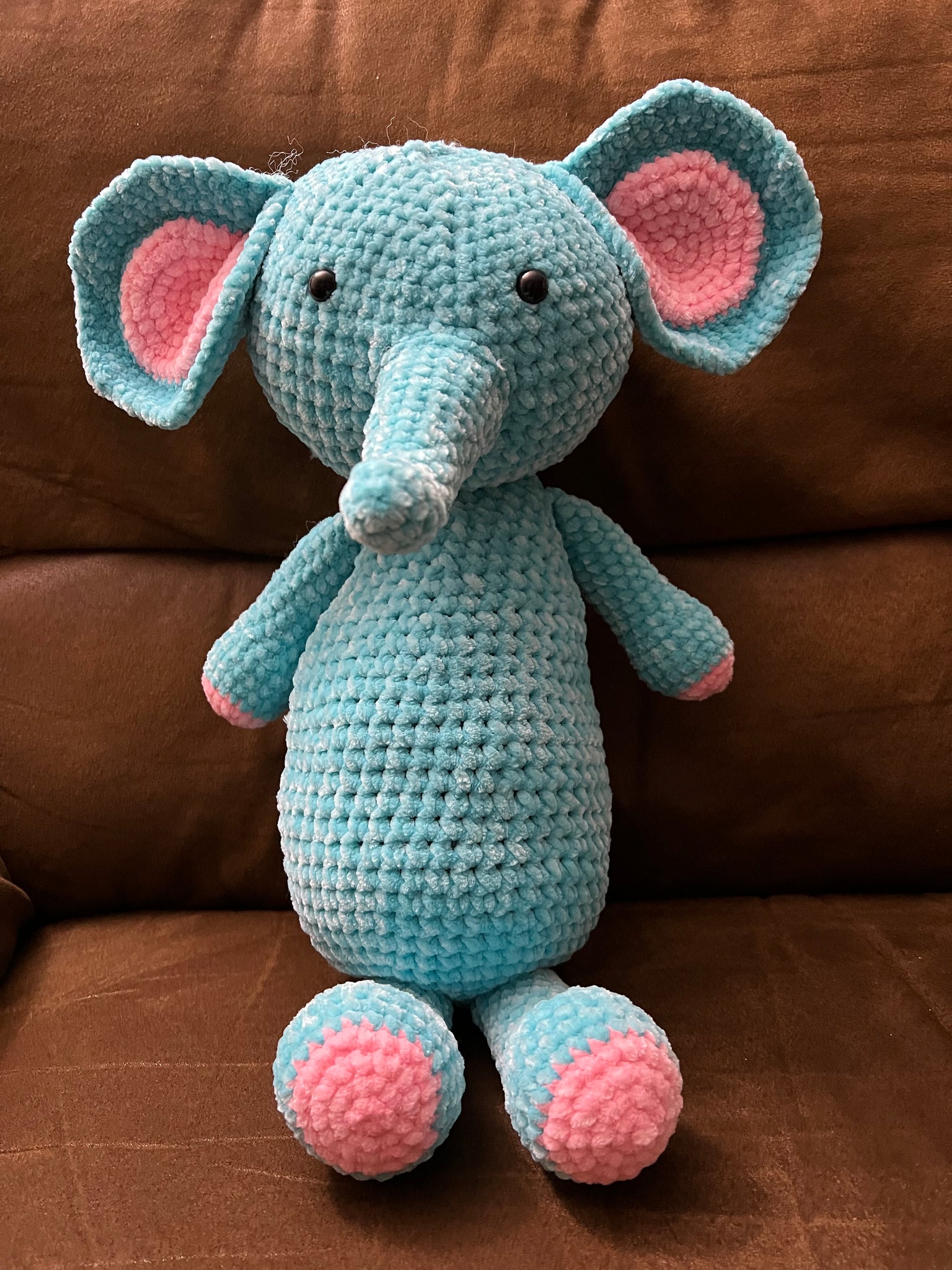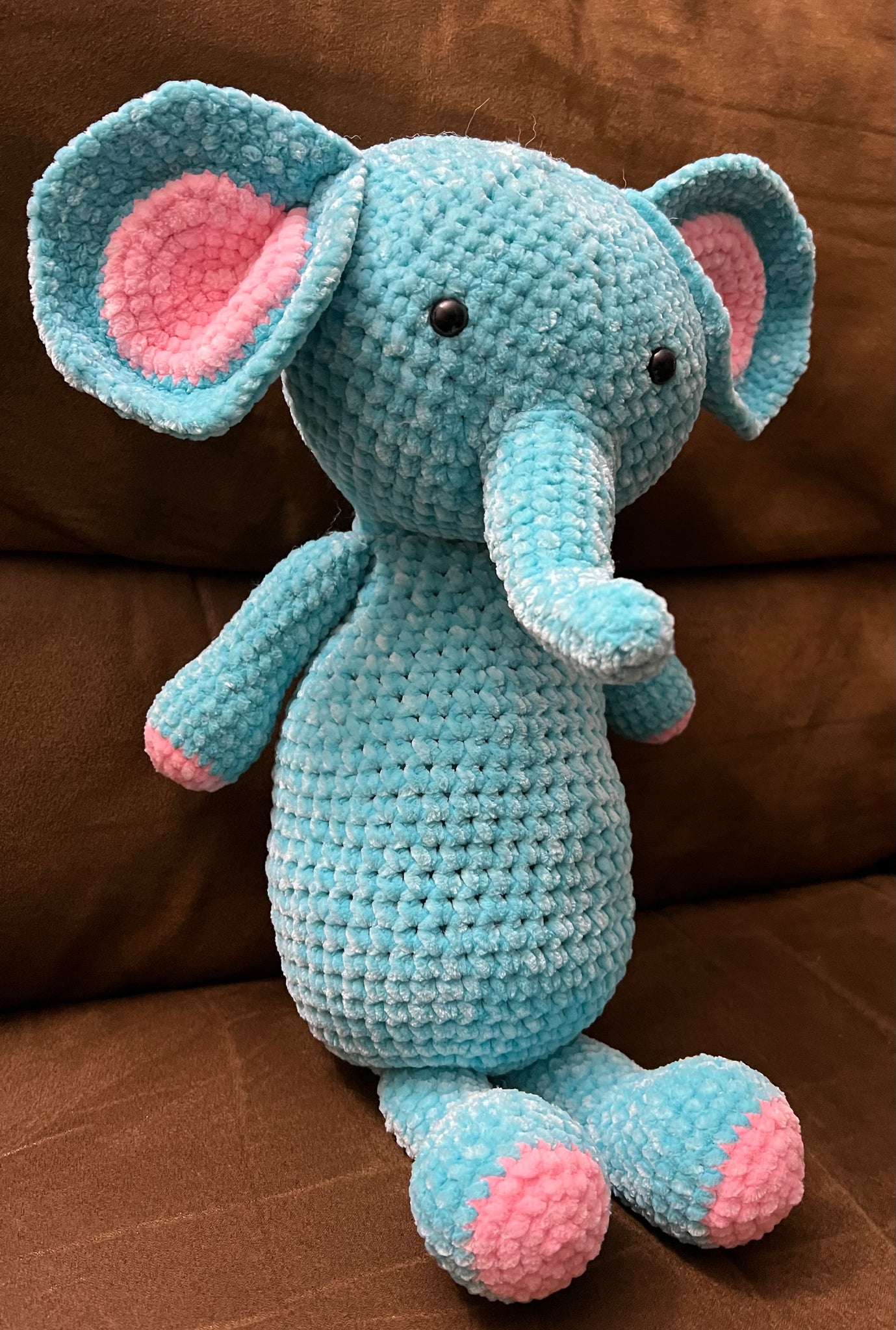 Stuffed elephant was Handmade with Love by the owner. This elephant measures 19 inches from head to toe and 13 inch arm span. These can be custom made in a different color and/or size with a possible price change depending on time and material. Message/email us with customization requests.