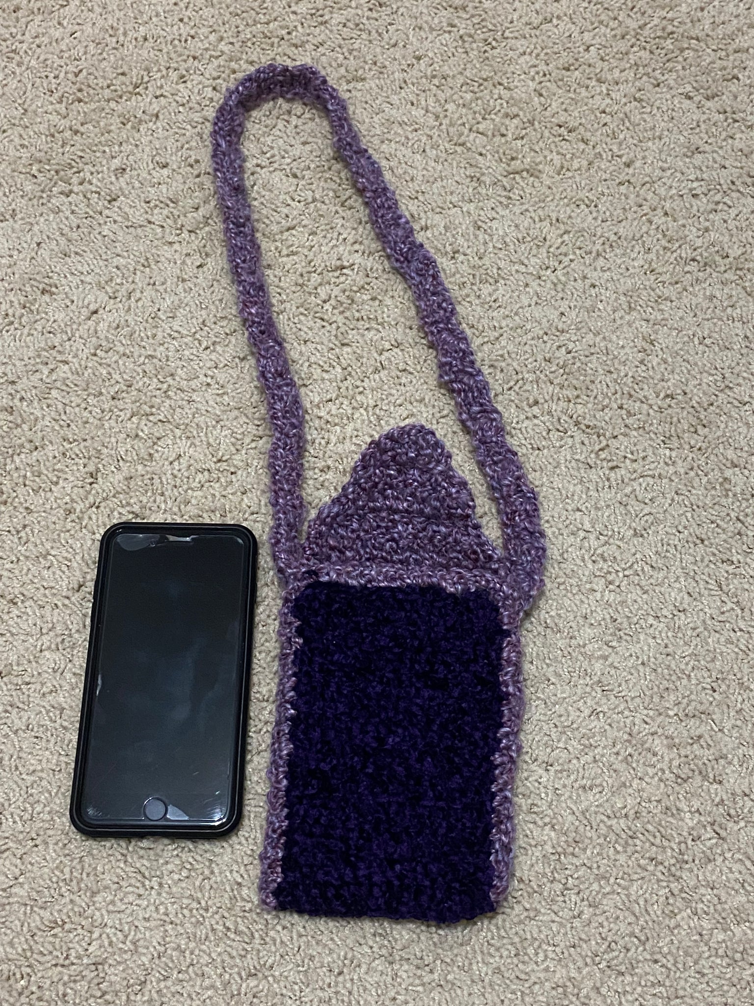 This is uniquely made for when all you want to carry is your cell phone and small thin wallet. Closure is a fold over flap. This cute little bag is 4.5 inches wide, 6.5 inches tall with a 34 inch strap.
