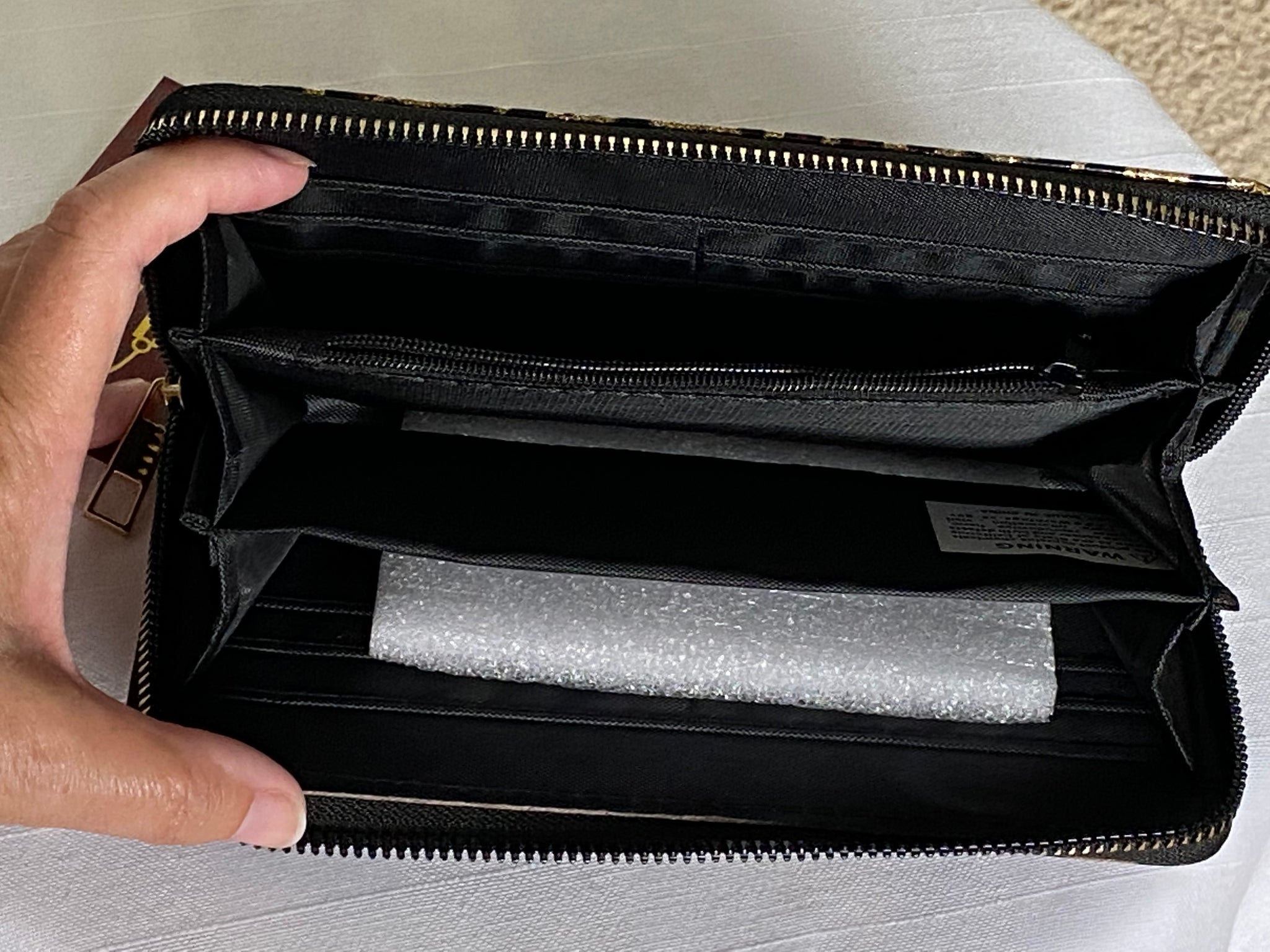 This wallet measures 7.5 x 4 x 1 inches. It has 2 cash pockets, 8 credit card slots, a zippered change pouch and two extra pockets. It has a zippered closure.