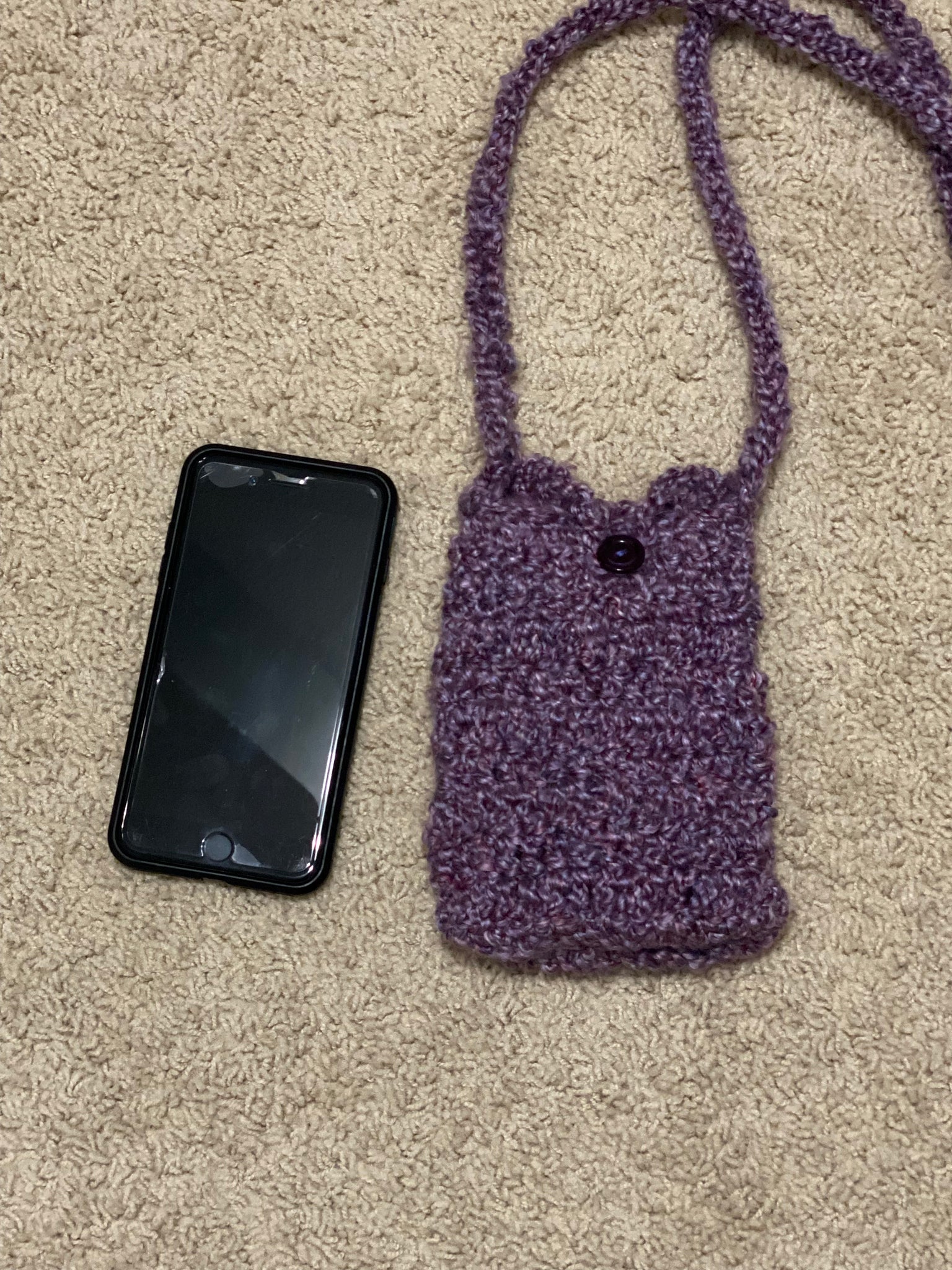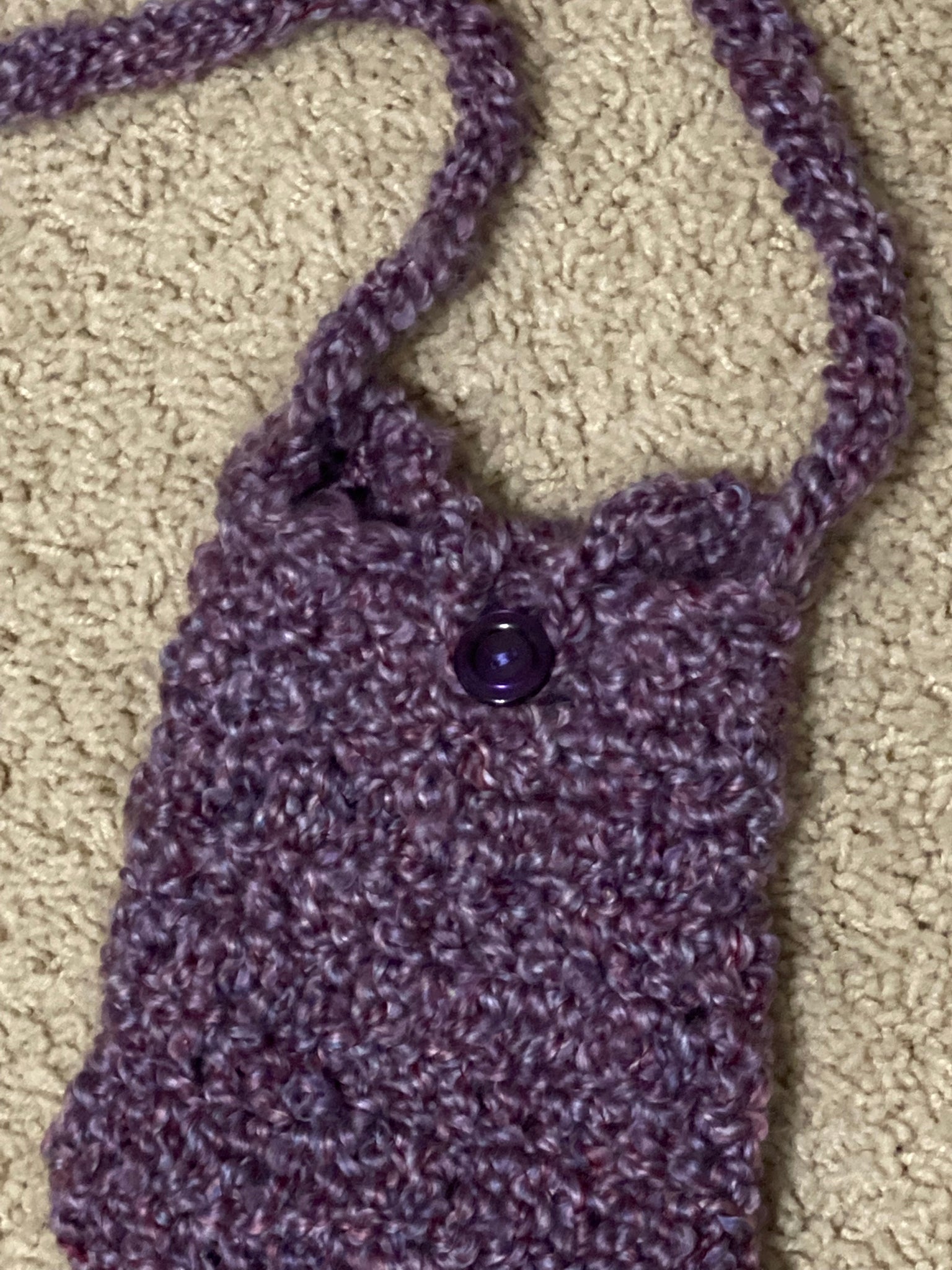 This is uniquely made for when all you want to carry is your cell phone and small thin wallet. Closure is a thin crochet string that attaches to a purple button. This cute little bag is 5 inches wide, 7 inches tall with a 57 inch strap.